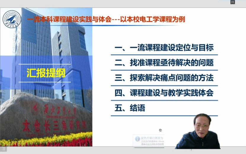 报告中,史教授结合西北工业大学电工学课程建设,对一流本科课程建设及发展进行了经验分享,分别从一流课程建设定位和目标、建设中亟待解决的问题、解决痛点问题的方法、课程建设与教学实践体会几个方面进行了阐述。