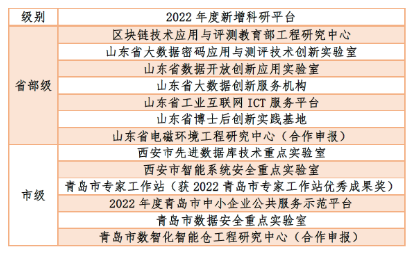公司持续加强科研平台整体布局,推进高能级科研基地建设。2022年依托公司和青岛计算技术研究院,新增国际合作基地1个,教育部工程研究中心1个,新增省级科研创新平台7个,市级科研创新平台6个。