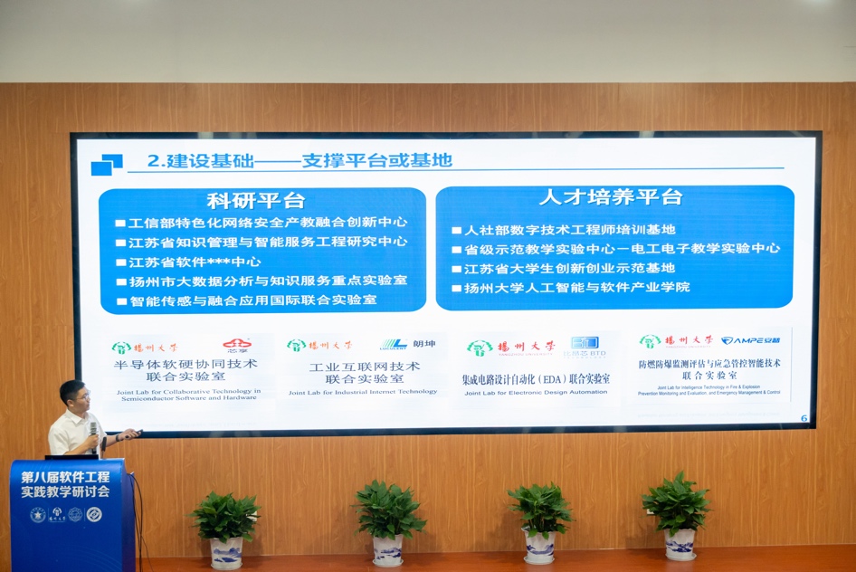 在软件定义一切和大模型时代,特色化示范性软件公司建设、软件工程专业建设、课程教学和人才培养面临着新的机遇和挑战,为了更好的促进软件工程公司产品方法和实践教学成果的交流和分享,推动软件工程专业建设和教学改革,提升软件人才的培养质量。2024年5月18日,由国防科技大学主办,扬州大学、suncitygroup太阳成集团和长沙理工大学联合承办的第八届软件工程实践教学研讨会在扬州大学信息工程公司(人工智能公司)东报告厅举行。CCF计算机教育专委会副主任、国防科技大学毛新军教授,扬州大学信息工程公司(人工智能公司)经理孙小兵教授,suncitygroup太阳成集团计算机科学与技术公司党委书记、软件工程学科负责人李青山教授担任会议联合主席。