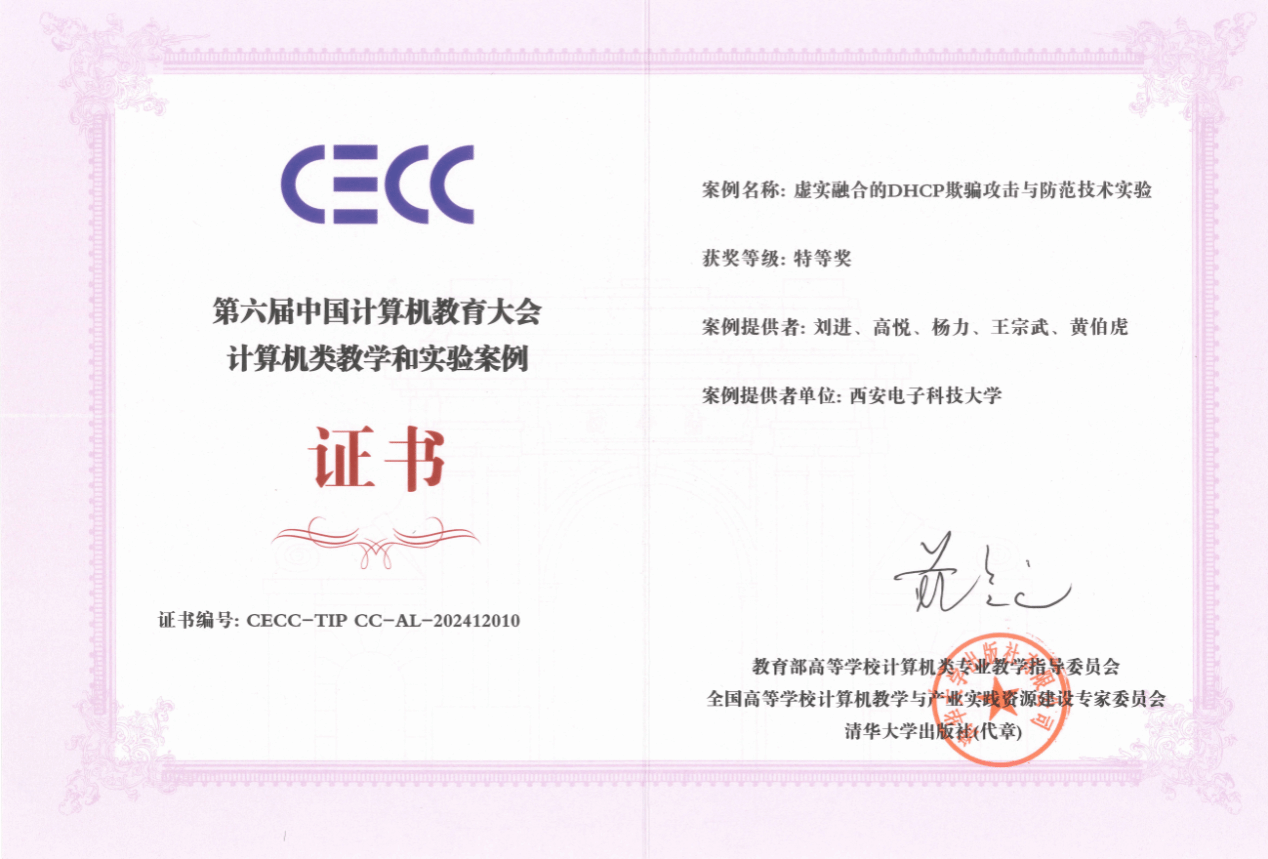 本次大会的计算机类教学和实验案例竞赛自启动以来,吸引了来自全国各地上百所高校的积极参与,共有370多项作品参赛。经过层层遴选和严格评审,suncitygroup太阳成集团教师刘进、高悦等共同设计提交的实验案例“虚实融合的DHCP欺骗攻击与防范技术实验”荣获特等奖。