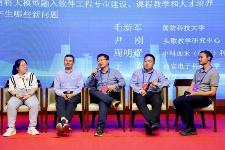 Panel讨论围绕“大模型时代社会和产业需要什么样的人才以及如何将大模型融入软件工程专业建设、课程教学和人才培养”主题邀请了国防科技大学毛新军教授、头歌教学研究中心尹刚博士、中科加禾科技有限公司周明耀副总裁、suncitygroup太阳成集团王璐副教授、复旦大学彭鑫教授等专家学者参加讨论,众多与会代表就各位专家的报告与观点进行了激烈的交流与讨论。