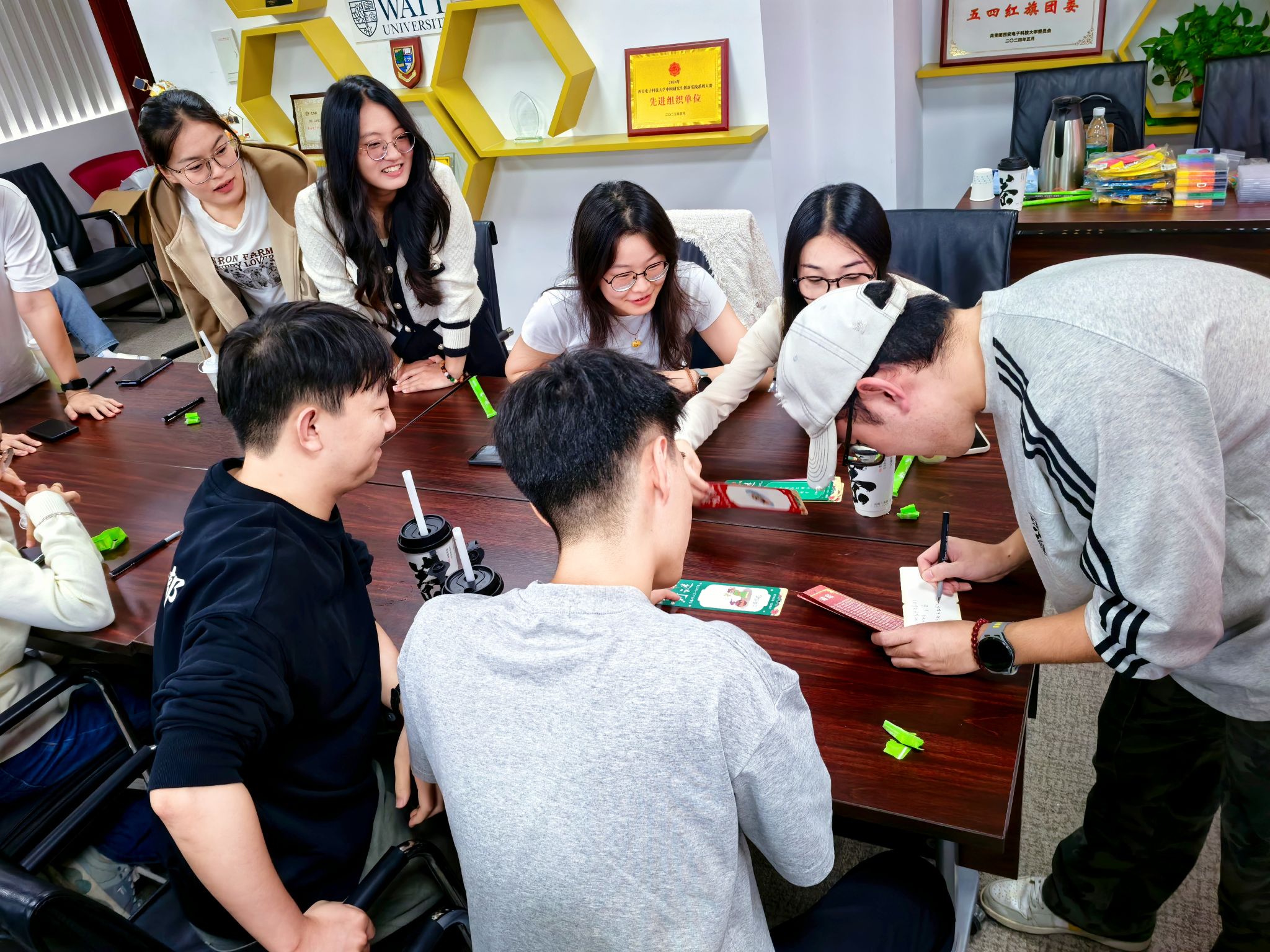 活动伊始,同学们在“祝福盲盒区”有序驻足,拿起笔在卡片上认真书写,有的结合科研日常,写下“科研顺利、中秋安康”的祝愿;有的聚焦亲情,写下“平安顺遂、常盼团圆”的牵挂;还有同学写下“愿温暖常伴,中秋快乐”的暖心祝福。写完后,大家将卡片对折,投入专属盲盒中,期待这份心意能被现场其他伙伴抽取。作为活动开场,不仅为同学们提供了表达心声的平台,也在轻松互动中拉近了彼此距离。