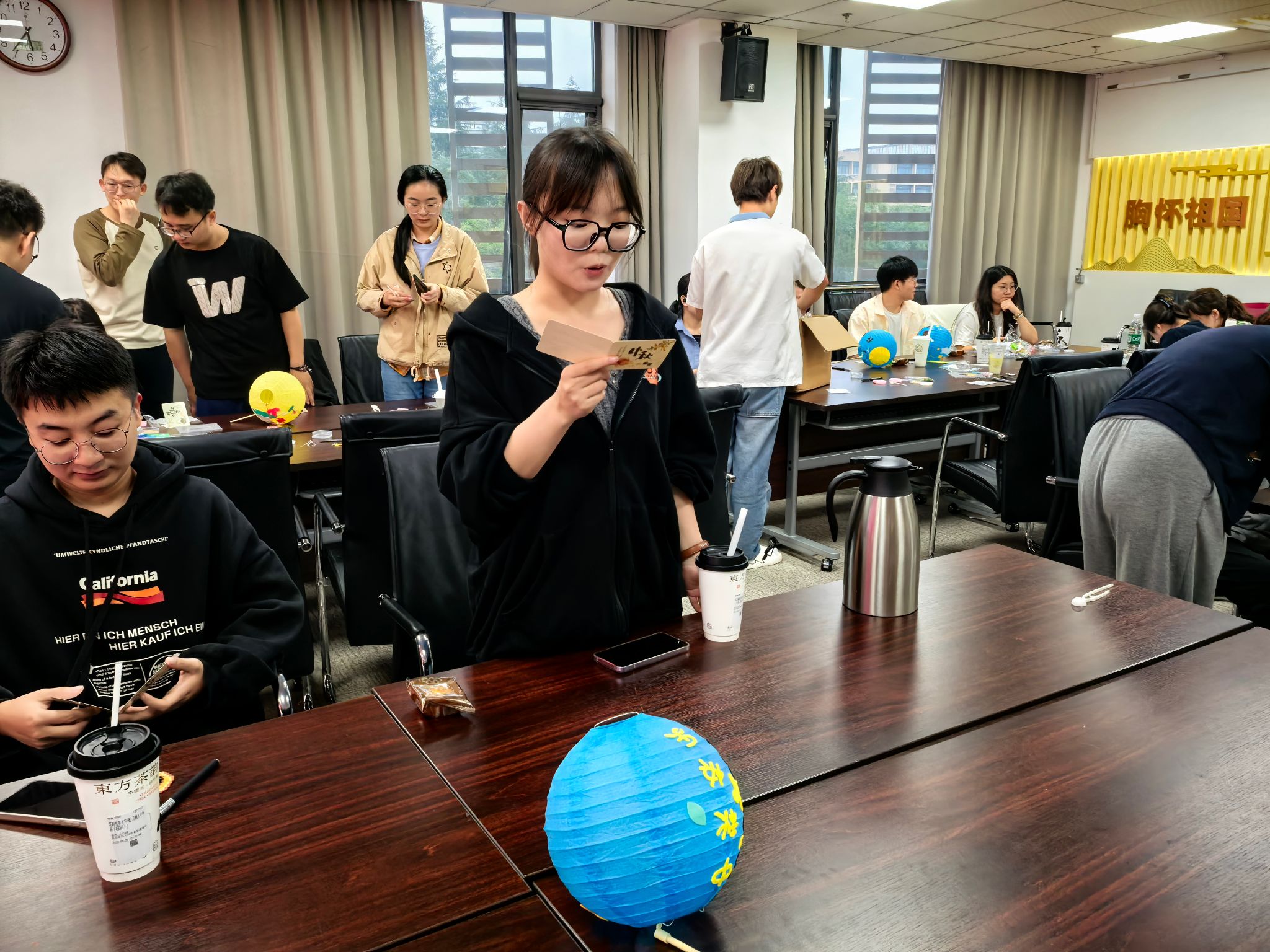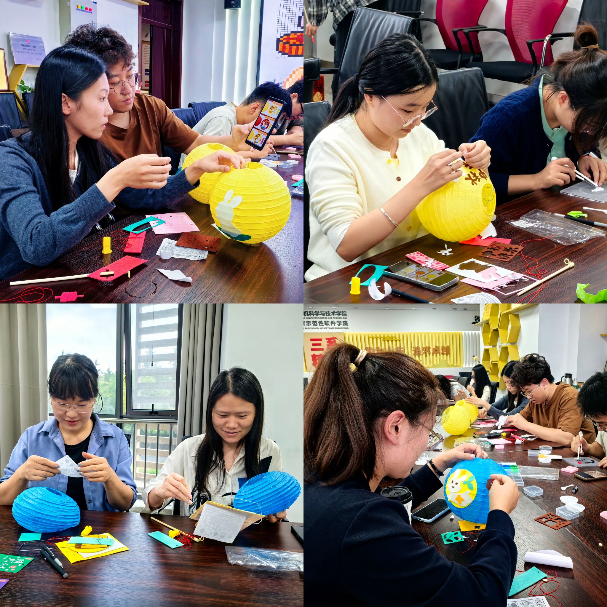 手工灯笼区则是一片专注与创意的天地。同学们充分发挥想象力与动手能力,有的同学在灯笼侧面写下“但愿人长久”的中秋诗句,有同学贴上玉兔的剪纸画。一个个独具特色的灯笼在手中逐渐成型,承载着对节日的美好期盼,整个手工灯笼区始终保持着专注有序的氛围,同学们在动手实践中感受传统节日的仪式感,也通过协作交流加深了彼此的互动,让中秋的美好期盼随着灯笼的成型愈发浓厚。