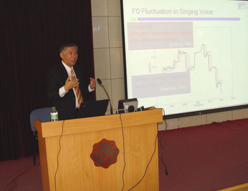到访期间,他们为公司教师、科研人员和研究生分别做了两场报告。铃木阳一教授做了题为“New watermarking technology for digital audio signal”(数字声音信号中的新型水印技术)的报告,赤木正人教授做了题为“Voice conversion for communication of linguistic/non-linguistic information in speech”(话音中语言及非语言交流的声音转化技术)的报告。他们分别介绍了各自在声响信号处理领域取得的最新研究成果。报告会场气氛活跃,同学们踊跃提出问题,两位教授耐心解答了同学们的问题,受到同学们的热烈欢迎。