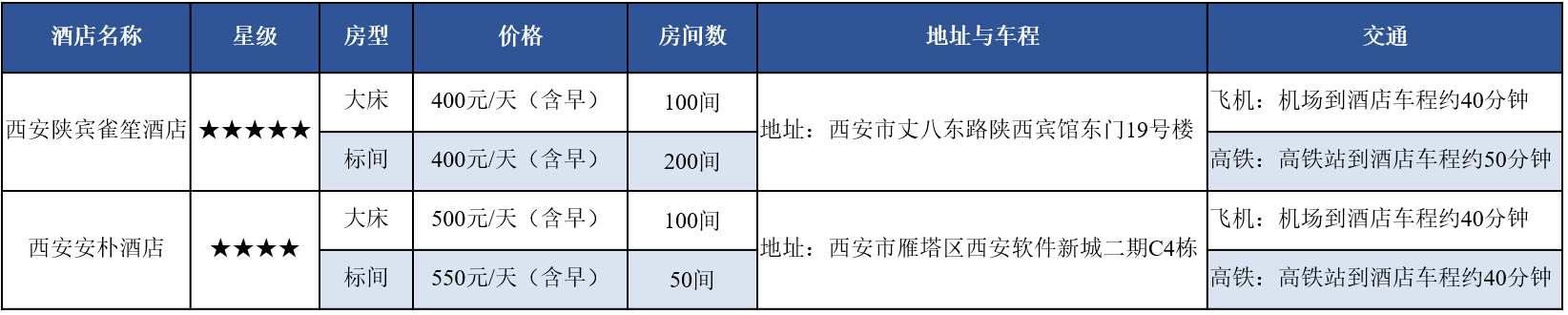 本次大会选取西安高新国际会议中心附近的酒店作为各参会代表的住宿酒店。住宿酒店(除西安安朴酒店外)组委会将安排大巴车统一接送。西安安朴酒店距西安市高新国际会议中心较近,约5分钟车程,步行约15分钟。酒店预订链接:http://kaili.kailimice.cn/f/WuTdwF