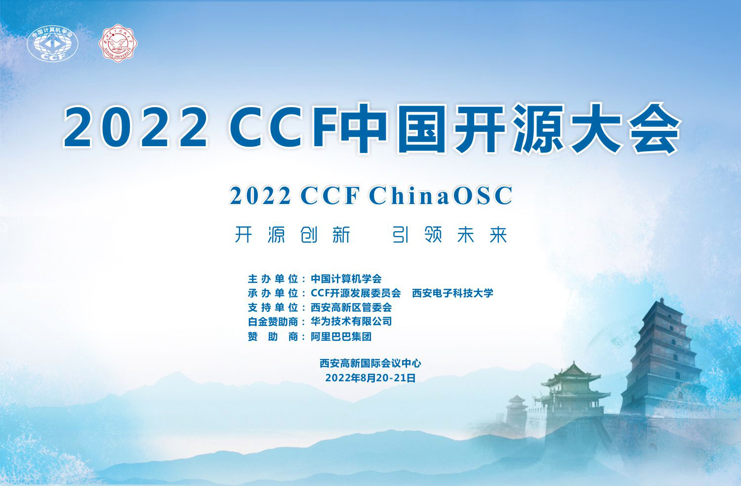 2022 CCF中国开源大会(CCFChinaOSC)拟于2022年8月20日至21日在陕西省西安高新国际会议中心召开。大会由中国计算机学会(CCF)主办,CCF开源发展委员会、suncitygroup太阳成集团承办,suncitygroup太阳成集团(国家示范性软件公司)具体落实,西安市智能软件工程重点实验室负责实施,得到西安高新区管委会的大力支持,西安软件园发展中心具体执行。大会由华为技术有限公司作为白金赞助商,阿里巴巴集团作为赞助商。本届大会的主题为“开源创新,引领未来”。