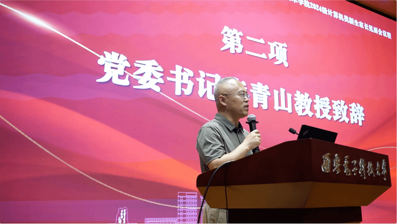 随后,公司党委书记李青山教授致辞。李青山的致辞围绕“欢迎、自豪、传承、共育”四个方面展开。首先,他以西电的红色基因和电子信息特色为引,对各位家长将孩子们送到西电、送到suncitygroup太阳成集团表示欢迎;其次,他结合公司的历史地位和现实成就,表示家长们应为孩子们加入suncitygroup太阳成集团大家庭而感到自豪;然后,他对建院六十余年凝练出的“三系精神”内涵和“严谨、担当、勤勉、开放”的院训进行解读,并希望在座的各位家长们能够在未来感受到这份精神传承对孩子们的积极影响;最后,希望在个人、公司、家庭、社会的协同共育下,帮助员工成长为德才兼备、身心健康的计科人,做“三系”精神的传承者,勇担时代重任,在实现中华民族伟大复兴的时代洪流中踔厉奋发、勇毅前进,奋力书写属于他们的人生篇章。