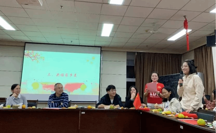 明月寄相思,思绪都会被牵往一个方向,那就是家乡。在“现场共话家乡美”环节,来自河南开封的2020级新生翟槟蓥向大家介绍了清明上河园、龙亭、大相国寺等著名景区,并欢迎大家到开封旅游参观,同时,她也诉说了在初到西电上课时的在B楼迷路的经历,让感同身受的同学们笑声不断。接着是来自广西河池的2019级的粟优同学分享了父亲送自己上学时的一个故事,虽然火车晚点,天气寒冷,但是热情好客的西安出租车司机帮助她们找旅店安顿行李,平凡的举动给她们带去了最热情的帮助,远在他乡,心里也依旧温暖。同样来自重庆涪陵的侯正宇也感叹,虽然从南方来到了北方,但食堂里的重庆小面、超市里的涪陵榨菜,让自己感觉到离家并不远。来自福建厦门已保研至清华大学的大四学长苏良才,介绍了为纪念郑成功收复台湾而设立的福建美食烙薄饼,表达了对祖国统一的美好期待。