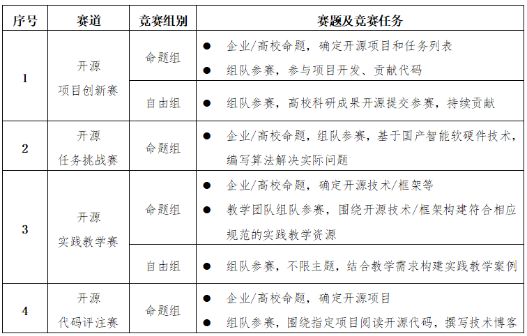 本届大赛面向本科和高职院校的教师、员工以及社会编程开发者,设置了开源项目创新赛、开源任务挑战赛、开源实践教学赛、开源代码标注赛四个赛道,开源项目创新赛和开源实践教学赛赛道还设置了命题组和自由组二种参赛形式。各赛道组织流程、详细评审规则等将在大赛官网以及竞赛官方支撑平台持续发布。