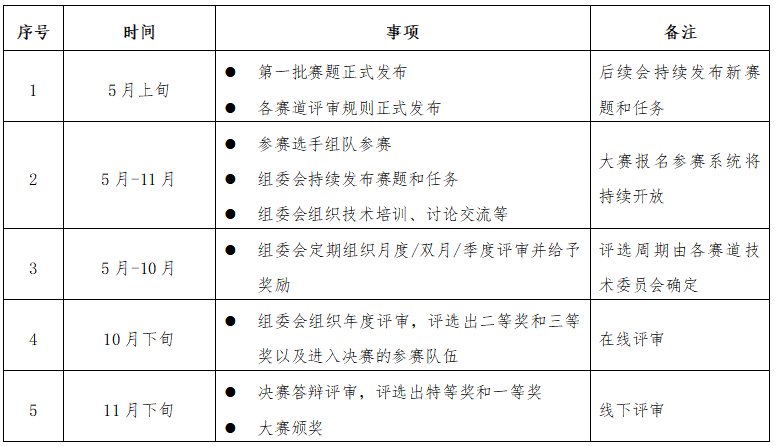 大赛采用全年开放、定期评比奖励、年度决赛颁奖的模式来组织,大赛年度主要时间节点安排如下,具体时间我们将持续发布到大赛官方平台:
