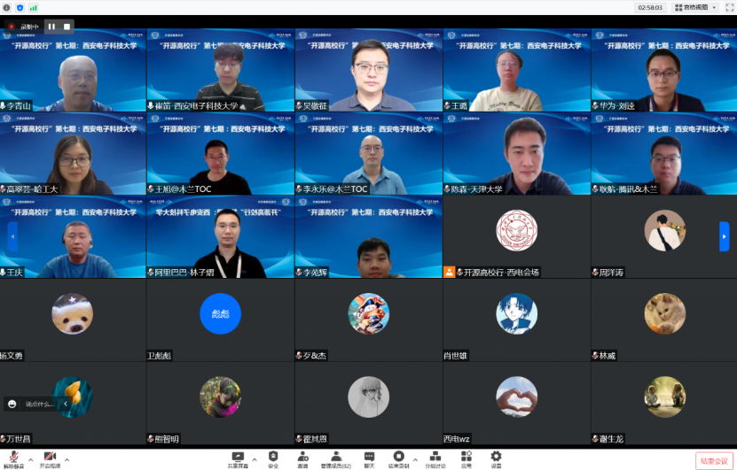 活动最后,王庆老师、耿航老师、王旭老师、李永乐老师进行了圆桌讨论,就“高校员工如何参与开源?”、“公司需要什么样的开源人才?”、“国内目前开源就业氛围如何?”、“高校目前内部开源教育氛围如何?”等关键问题展开讨论。四位专家与西电师生通过线上提问进行持续交流,互动交流环节气氛热烈。