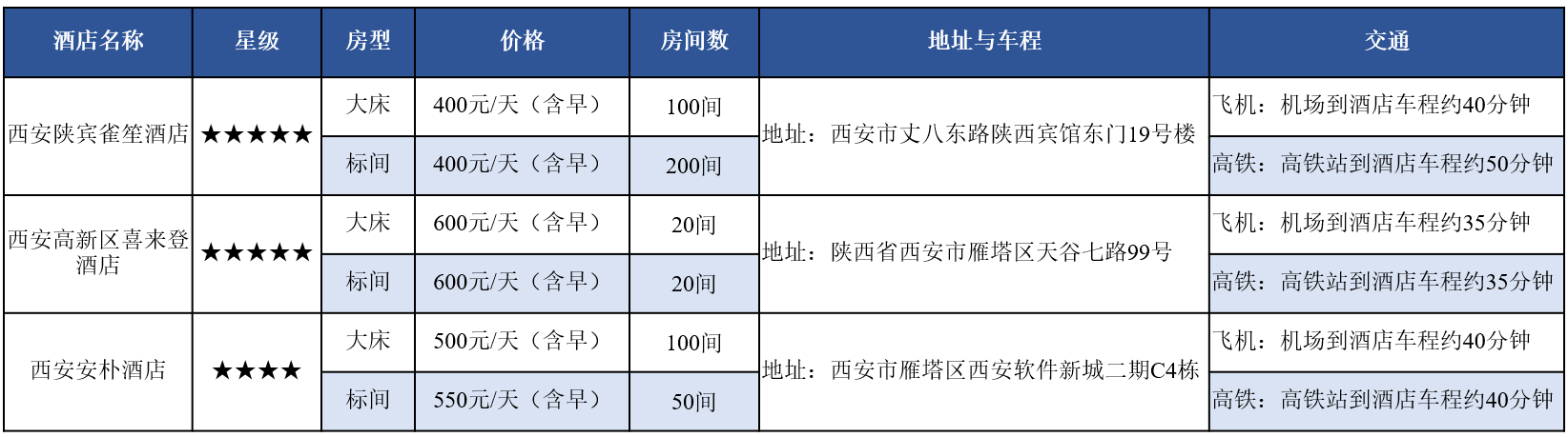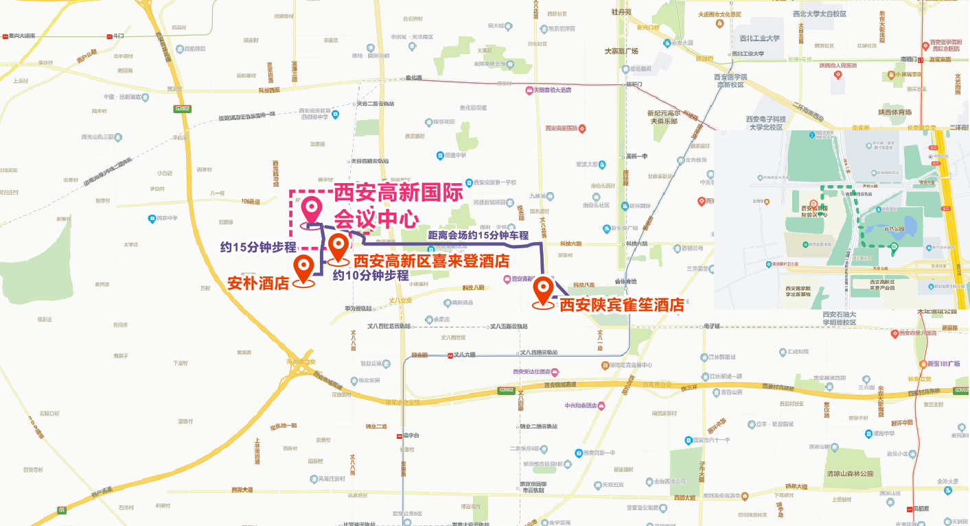 本次大会所推荐酒店,陕西宾馆雀笙酒店与安朴酒店都将由会务组提供酒店至会场的摆渡车服务,陕西宾馆雀笙酒店距离本次会议的举办地西安高新国际会议中心约15分钟车程,安朴酒店距离西安高新国际会议中心约5分钟车程。西安高新区喜来登酒店距离西安高新国际会议中心步行约10分钟。酒店预订链接http://kaili.kailimice.cn/f/WuTdwF