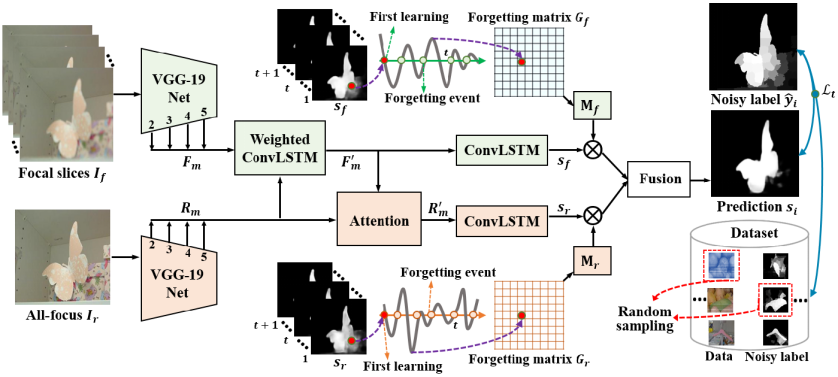 冯明涛博士长期从事复杂场景视觉感知与理解领域相关的研究工作,在公司良好科研环境支持下,所做系列工作相继发表在IEEE TIP、PR、ICCV等期刊会议,并入选2021年青年托举人才,是论文“基于像素级噪声标签的学习策略:一个光场显著性检测的新视角”(“Learning from Pixel-Level Noisy Label : A New Perspective for Light Field Saliency Detection”)的第一作者,张亮教授是该论文的通讯作者,合作者有湖南大学王耀南教授、澳大利亚西澳大学Ajmal Mian教授等,suncitygroup太阳成集团是该论文的第一完成单位及通讯作者单位。该论文受人类学习过程中“学习-遗忘-再学习”的机制所启发,解析了不确定标签监督下深度网络模型训练过程中的遗忘规律,抑制不确定标签对深度网络模型训练的干扰,进而大幅度提升深度网络模型的鲁棒性和稳定性。