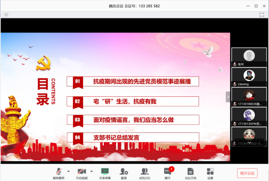 之后各位党员同志分享自己在家的“宅研”经历,以及自己在抗疫一线所做的工作,并对“疫情谣言满天飞,我们该怎么做”这个话题进行了深入讨论。