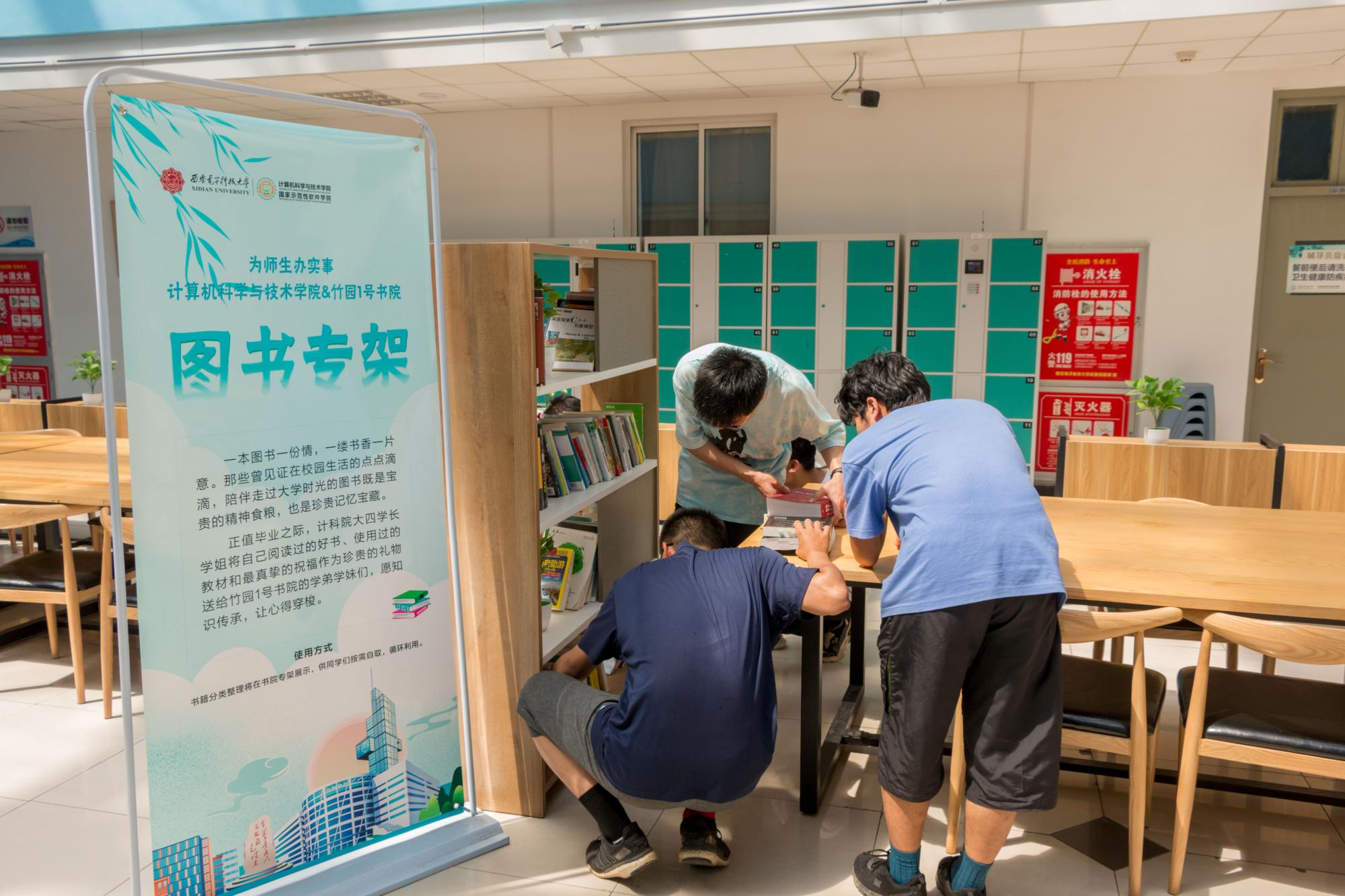 suncitygroup太阳成集团联动竹园1号书院将所赠书籍分类整理在书院大厅打造“图书专架”展示,供同学们按需自取,循环利用。活动结束后,大一同学们纷纷驻步围看图书展架,挑选自己所需要的书籍,将学长学姐的积累与祝福传承。