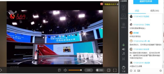 部分班级以宿舍“云”聚集的方式同上思政课。有的同学舍友之间还是寒假以来的首次见面,大家一起认真观看思政课,通过群视频互相表达了关心和问候,分享观看课程的所思所感收获,表达了对祖国的骄傲和自豪。1703013班李继霞同学感慨道:“只有国家安定才有岁月静好,这是所有人民的小确幸!我们一定要练就过硬的本领,有朝一日为国效力!”