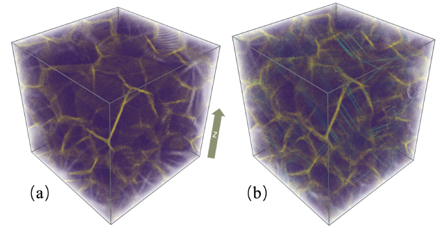 图2.铜纳米晶粒(包含一千万个原子以上)的拉伸模拟。(a)具有面心立方晶体结构的铜原子(紫色),晶界原子(黄色)。(b)沿z轴拉伸10%后的铜纳米晶粒产生位错结构(青色)
