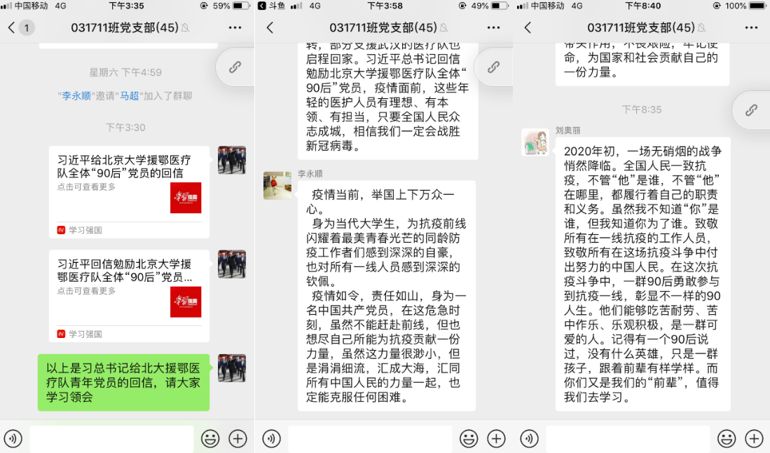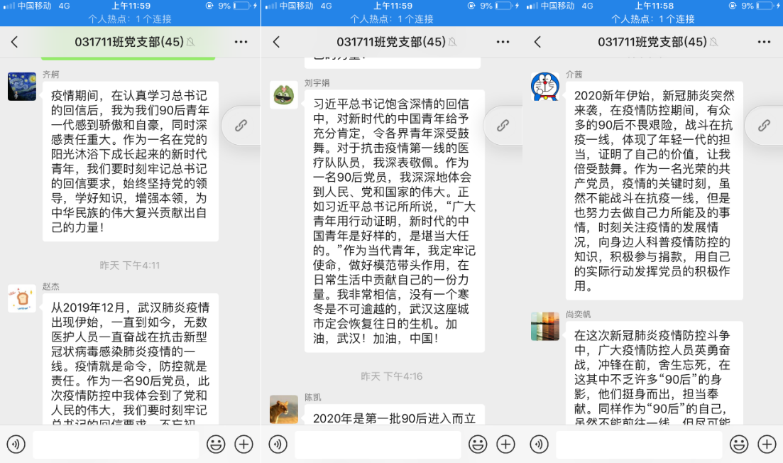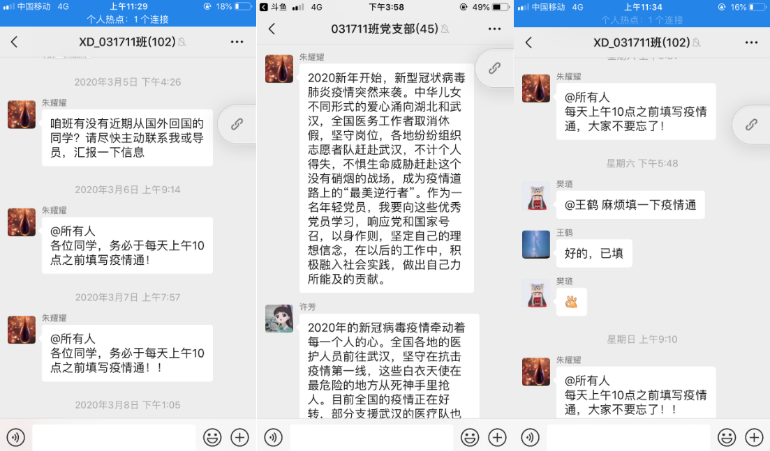 第一党支部支委成员朱耀耀感慨道:“自疫情开始,中华儿女以不同形式的爱心涌向湖北和武汉,全国医务工作者取消休假,坚守岗位,各地纷纷组织志愿者队赶赴武汉,不计个人得失,不惧生命威胁赶赴这场没有硝烟的战场,成为疫情道路上的‘最美逆行者’。作为一名年轻党员,我要向这些优秀党员学习,响应党和国家号召,以身作则。”他每天准时提醒班级同学填写“疫情通”,督导大家做好个人情况汇报工作。
