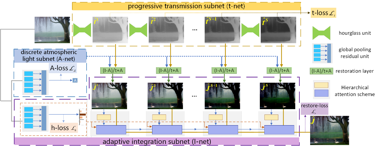论文针对当前图像去雾霾算法采用单一网络无法适应不同程度雾霾的问题,提出了一种多级渐进式去雾霾网络,从轻到重逐级处理不同程度雾霾,并通过引入记忆网络(memory network)和两级注意力机制计算每阶结果的权重,实现自适应融合,最终得到较好的复原效果。
