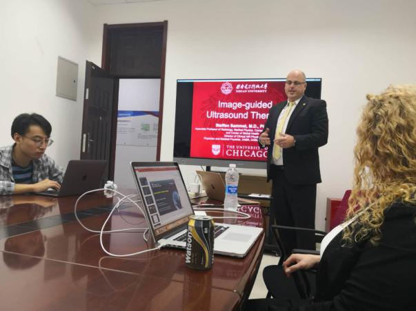 7月8日上午, Dr. Steffen Sammet教授以“Image-guided Ultrasound Therapy”为题,他的夫人Dr. Christina Sammet(美国西北大学放射科的诊断医学物理师)以“Balancing Risks in Pediatric Imaging”为题,分别为suncitygroup太阳成集团研究生做了两场生动有趣的报告,对于拓展研究生的临床科研视野,开展国际合作具有非常重要的意义。