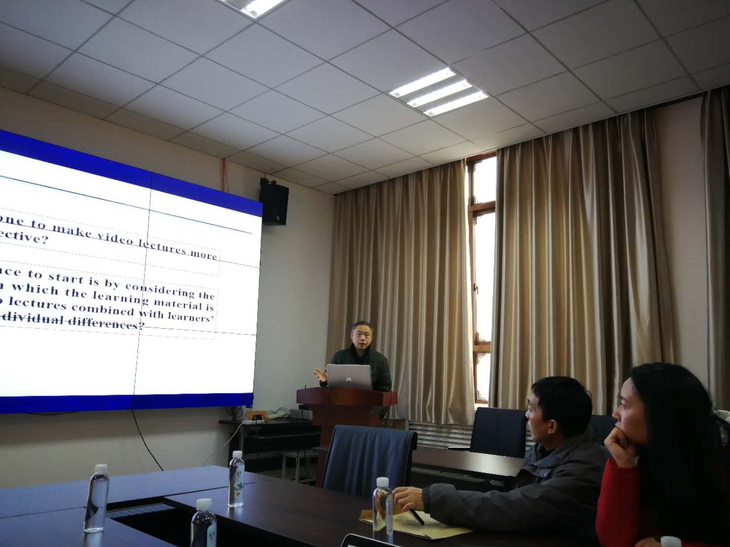 杨九民教授围绕视频课程教与学--实证研究与实践应用进行介绍。首先对视频课程设计的四要素,接着就视频本身的呈现模式、知识类型和学习者的个体差异均影响视频教与学的效果等进行了分析和说明,最后,分享了教育信息化跨科学领域的自然基金项目申请经验。报告结束后,杨九民教授与公司副经理苗启广教授就课堂教学设计、MOOC课程建设进行深入讨论;苗启广副经理也表达了与华中师范大学教学信息技术公司加强教学交互和学术研讨的合作意愿。