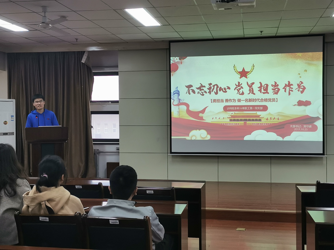 (通讯员 曹佳妮)习近平总书记在十九大报告中指出,要在全党开展 “不忘初心、牢记使命”主题教育活动,用党的创新理论武装头脑,推动全党更加自觉地为实现新时代党的历史使命不懈奋斗。中共中央决定从6月开始,在全党自上而下分两批开展“不忘初心、牢记使命”主题教育活动。10月25日下午五点,suncitygroup太阳成集团本科2016级软件工程第一党支部在G楼516开展“不忘初心、牢记使命”主题教育党课活动。活动由支部书记郑守建主持。