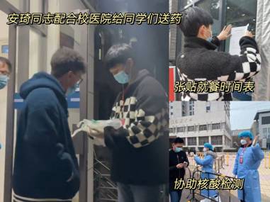 “我多次参与过核酸检测的工作,主要负责维持队伍秩序,测量体温。最近校医院开通了线上买药的服务,我又参与了给同学们配送药物的工作,每天配送两次,给同学们挨个儿送到宿舍楼下去。”支部研究生党员安琦说:“一直在外面很冷,配送药物经常需要晚上出去。现在是困难时刻,我们更应当担负起党员的责任,为公司核公司分担工作,为同学们的生活保障提供力所能及的服务。相信我们一定会早日战胜疫情。”