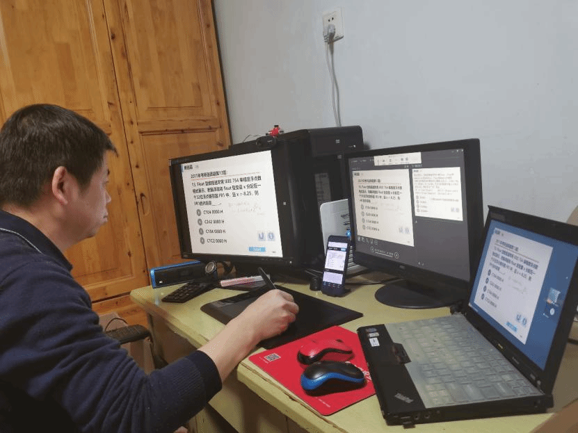 在教学设备的选用上,车老师依托电脑、手机、音箱、数位板、手写笔等构建了一套体系化的在线教学环境。三个在线教学软件各对应一台显示器,其中台式电脑配备了一台音箱,可以随时收到同学们在课堂上的实时消息。其中,雨课堂还专门有一台用于遥控的手机。数位板与手写笔为同学们提供了与线下课堂体验类似的实时板书环境。车老师同时利用录屏软件对课堂进行全程录制,课程结束后仔细剪辑后发送给同学们,供大家查漏补缺。