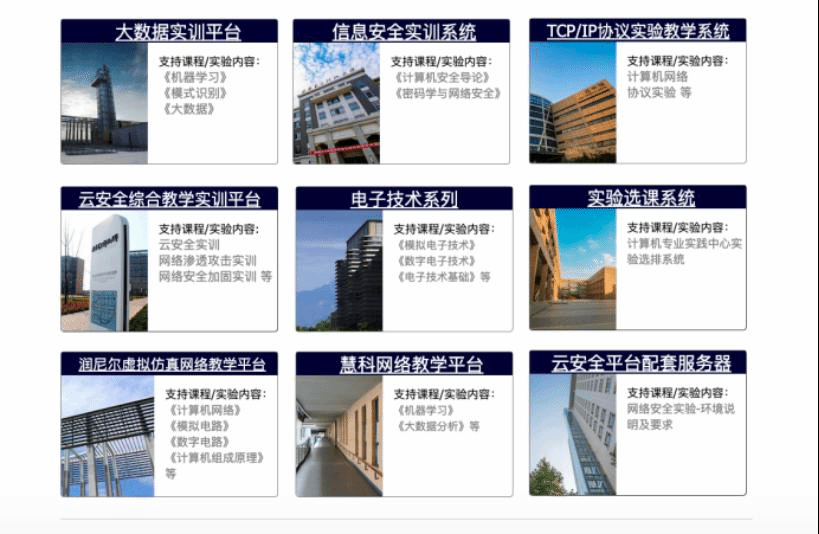 平台集成了当前示范中心负责的所有线上实验系统,涵盖人工智能、大数据、网络安全及电子技术等四大类、百余项实验内容,能够为机器学习、模式识别、大数据、计算机网络、密码学与网络安全、模拟电子技术、数字电子技术等十余门课程提供7*24小时一站式在线实验支持。同时,示范中心还紧急开展了本学期课程的虚拟仿真实验平台建设,推出了机器学习、大数据、模拟电子技术等8门课程的虚拟仿真平台。