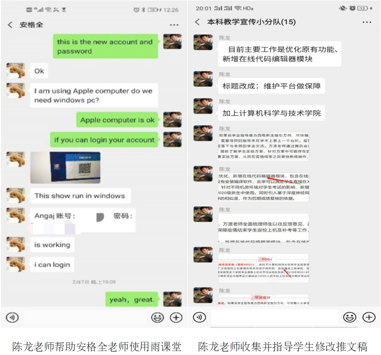 如此大规模的线上教学工作,打得人措手不及。但正因为有这几位可爱的教务老师,suncitygroup太阳成集团的线上教学不但秩序井然,而且涌现出多种多样的典型。首先出场的就是我们的陈龙老师,他积极沟通各位科任教师,为他们答“疑”解“惑”,尽全力消灭一切阻碍线上教学的因素。公司有一门外教课程“软件过程与项目管理”,疫情发生时任课教师安老师在印度,陈龙老师迅速与安老师取得联系,带他提前熟悉各类在线学习平台。当得知“学在西电”不能在国外登陆后,又第一时间远程帮助安格全老师安装并测试雨课堂,保证安老师在线教学的顺利进行。他还按照公司总体部署,做好2016级本科生毕业设计中期检查和学籍等各类工作;并主动加入本科教学宣传小组,竭尽所能地贡献自己的聪明才智。
