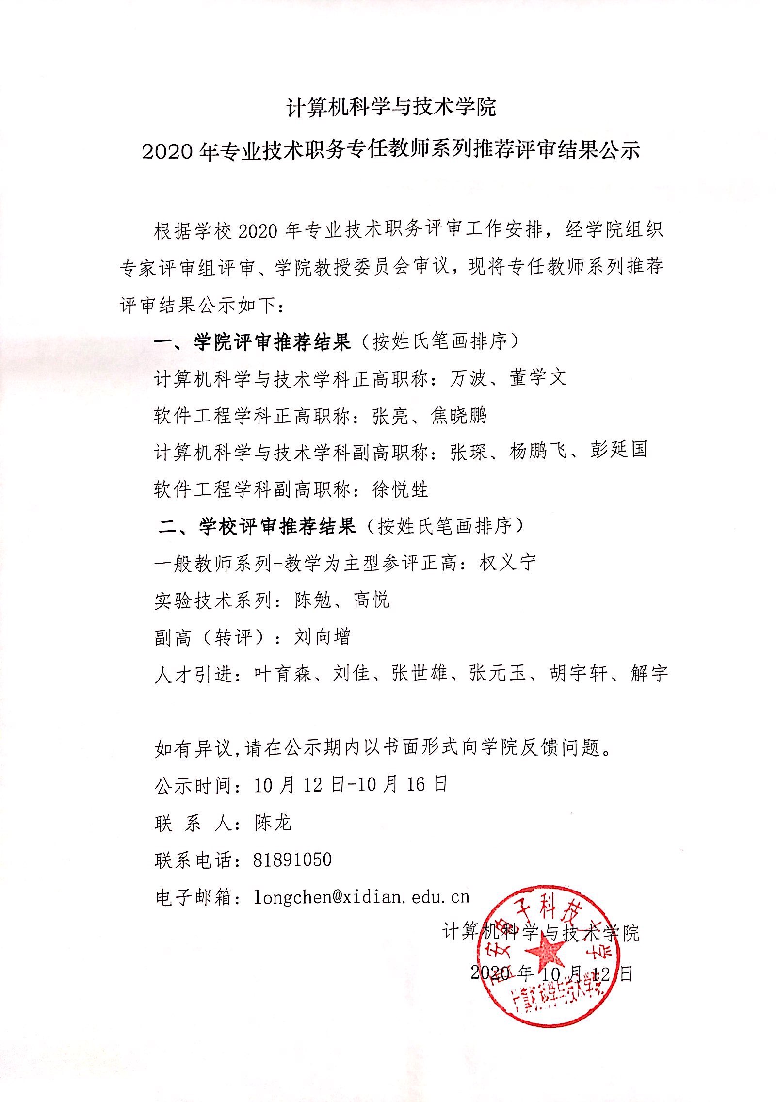 2020年专业技术职务专任教师系列推荐评审结果公示