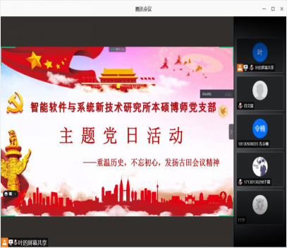 (通讯员 张恒运)为庆祝中国共产党建党100周年,深入学习贯彻习近平总书记在党史学习教育动员大会上的重要指示精神,从党的非凡历程和实践中汲取初心使命的力量,suncitygroup太阳成集团智能软件与系统新技术研究所本硕博师联合党支部于2021年5月28日下午开展了“重温党史,不忘初心,发扬古田会议精神”主题党日活动。活动由支部副书记吕文琪同志主持,共计56人参加,会议以线上和线下的方式进行展开。