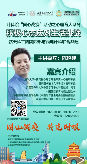 (通讯员 马治东)为帮助公司师生缓解因疫情防控、就业择业、升学毕业而产生的心理压力,进一步提升广大师生的心理调试能力,2022年1月6日晚,suncitygroup太阳成集团计算机网络与物联网研究所本硕博师第一联合党支部和中国航天科工集团第四研究院第四总体设计部信息保密联合党支部共同策划组织开展了“积极心态应对生活挑战”心理育人报告会,邀请清华大学伯克利心理学高级研究中心特聘教授陈绍建进行专题讲座。航天科工四院四部党委书记周逸,计算机科学与技术公司党委书记李青山、副书记张莹莹出席,200余名公司师生、四院四部职工参加,会议由两个联合共建支部的党支部书记史阿云和张志为共同主持。