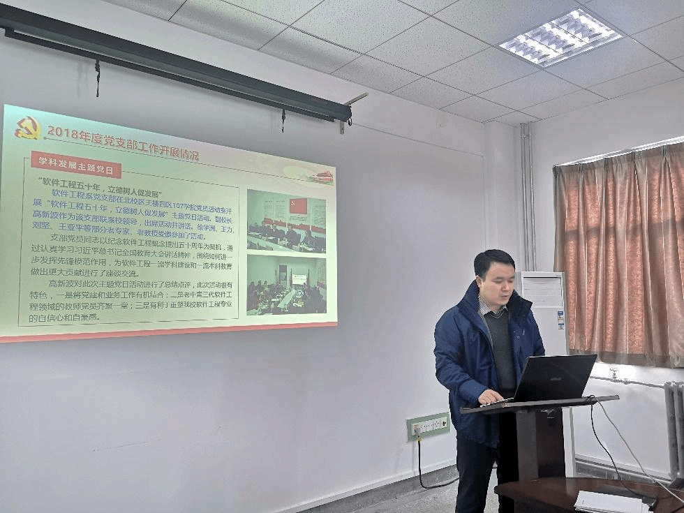 会议第一阶段,支部书记宋胜利代表软件工程系党支部向全体党员大会述职,从基层组织建设、思想政治建设、三会一课学习、主题党日活动、党建与业务工作融合、党员发展与党费收缴等六个方面总结了2018年度软件工程系党支部开展的主要工作和取得的成绩。同时,宋胜利向党员大会汇报谈心谈话活动收集的关于党支部和上级党组织的意见建议,包括党建与业务工作联系不够紧密、党支部建设工作内容不够丰富等问题,进行分析整理,查摆存在的问题和不足,从“三个统一”、“三个强力”和“三个导向”维度提出了改进措施的指导思想、时间点和路线图,以打造标杆支部和一流教师支部为目标,努力做好教育党员、管理党员、监督党员,全力做好组织师生、宣传师生、凝聚师生和服务师生工作。报告结束后,全体党员对党支部工作进行民主评议,肯定了党支部在2018年开展的各项工作以及取得的成果,充分发挥了教师党支部的战斗堡垒作用,也为全院其它教职工支部、本硕博师联合支部、员工支部等树立了榜样。同时,也进一步深入破剖析了存在的问题和产生问题的根源。