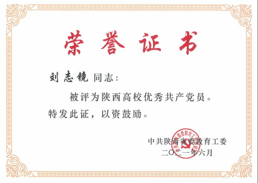 公司刘志镜教授在全省高校“两优一先”表彰中获“陕西高校优秀共产党员”称号