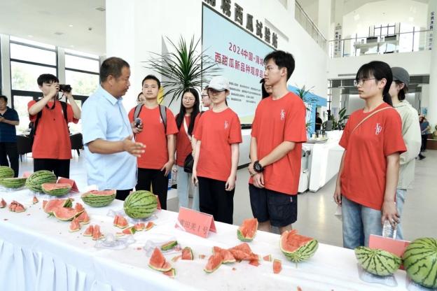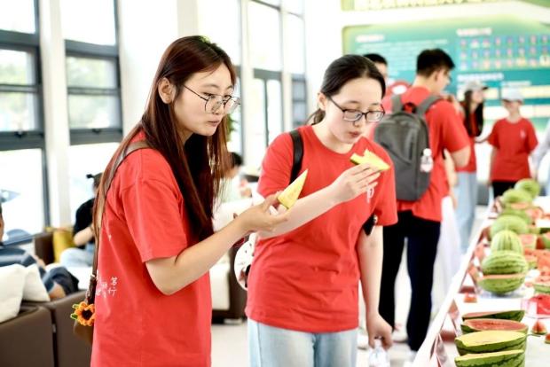 来到西甜瓜新品种观摩品鉴会现场,农户们热情招呼着向同学们介绍培育的“新作品”,同时邀请大家品尝。从龙池镇农户、曾经的西瓜种植大户到如今的“农掌门”,新型科技服务平台的负责人代崇化向大家介绍着他的个人经历。抱着红彤彤、黄艳艳的西瓜,香甜的汁水沁润干渴的喉咙,科技助农的故事不断温暖着同学们的心头。