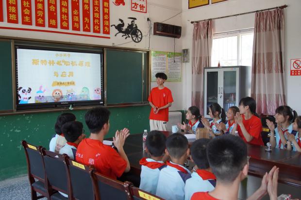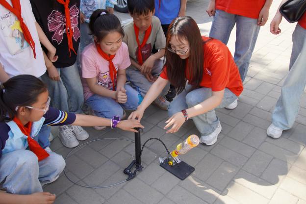 “小朋友们,大家知道什么是斯特林发动机吗?”面对大家的好奇,软件工程专业李佳乐向小朋友们展示了斯特林发动机的工作过程,结合近期国产汽车品牌热门话题,用生动活泼的语言向大家介绍了各种发动机的组成与工作原理,包括内燃机外燃机的区别、燃气冲压发动机以及新能源汽车的电机等。理论课结束后,团学骨干们与小朋友一起分为三组,共同完成“水火箭”的拼装与发射。“哇!火箭发射的好高!好好玩呀!”在一片欢声笑语中结束了此次社区实践公开课。