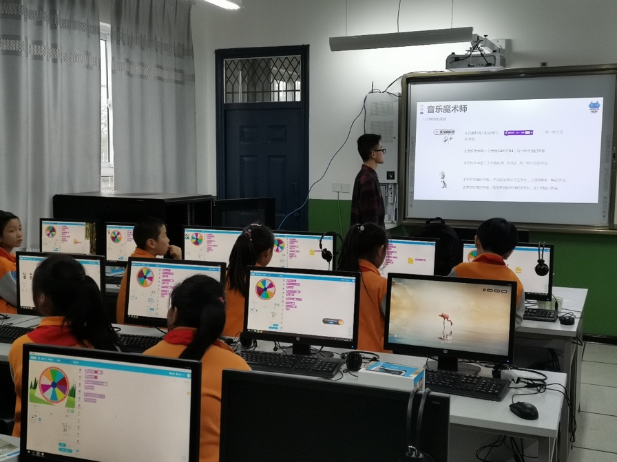 启动仪式后,科创小屋首堂科创课开讲。科创小屋配备了3D打印机、机器战车、无人机等最新的科创课程教具。小员工们首次接触MATA机器人,在科创导师和老员工支教志愿者的指导下,通过简单编程使机器人播放音乐。当机器人成功播放出《我和我的祖国》熟悉的旋律,同学们发出阵阵惊叹。课间西电师生与小员工们积极互动,同学们对科创小屋和高科技的教具充满新奇,提问异常活跃、热情高涨。随后,老员工们还给高年级班级带来了采用基于程小奔教育机器人的模块化编程等精彩内容。