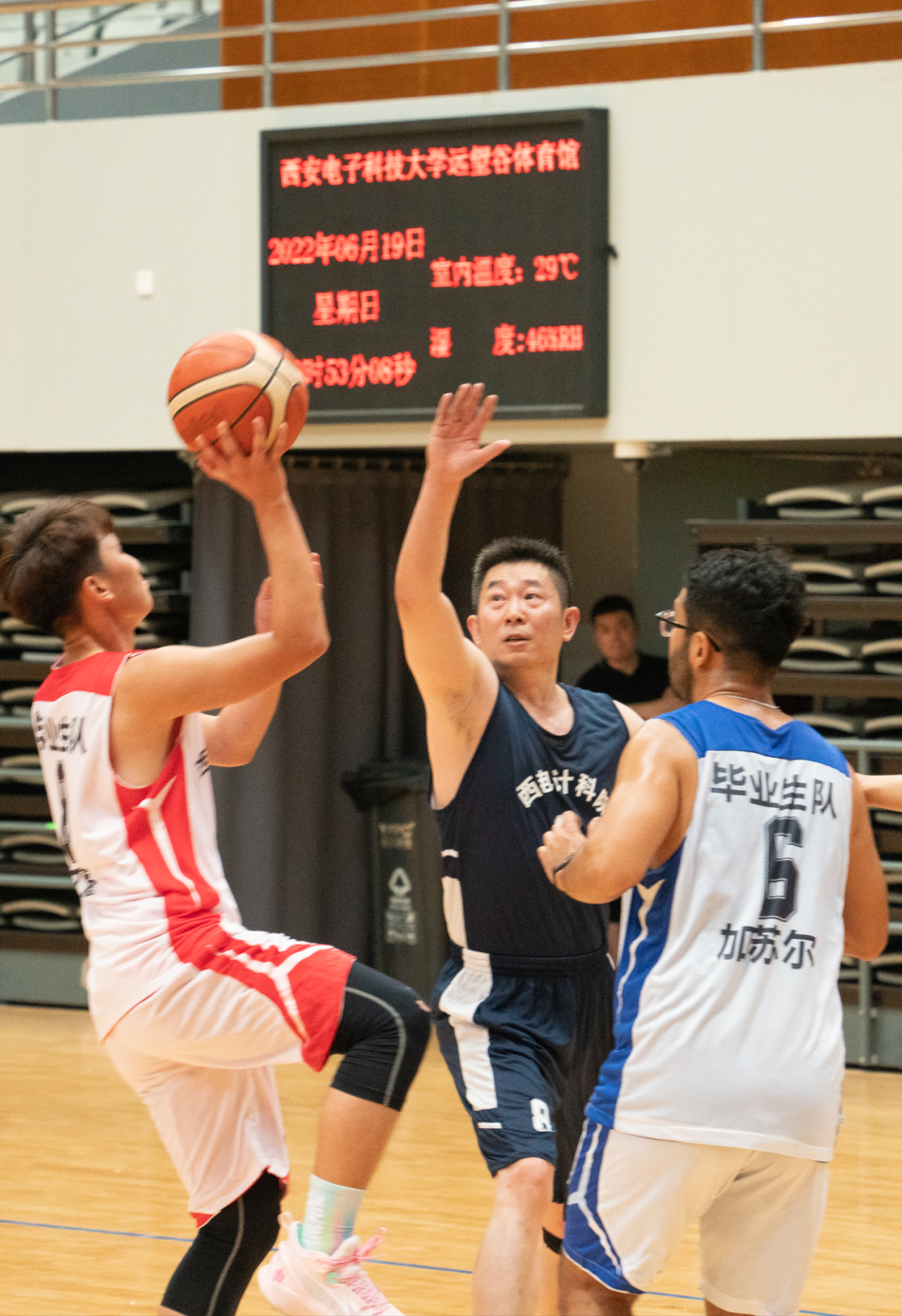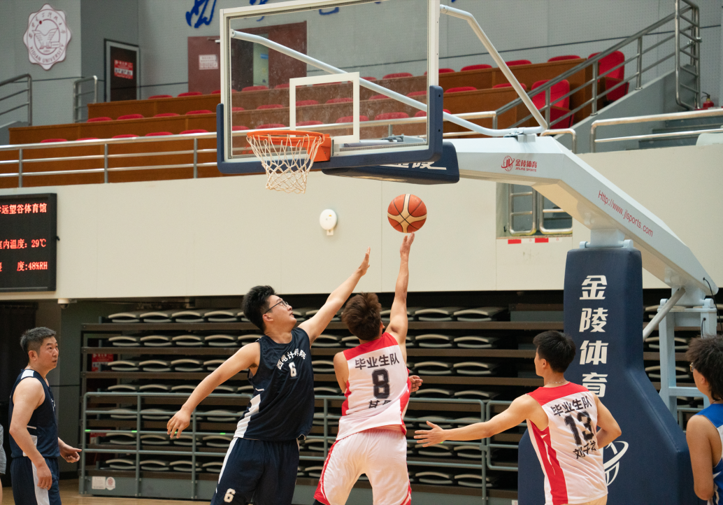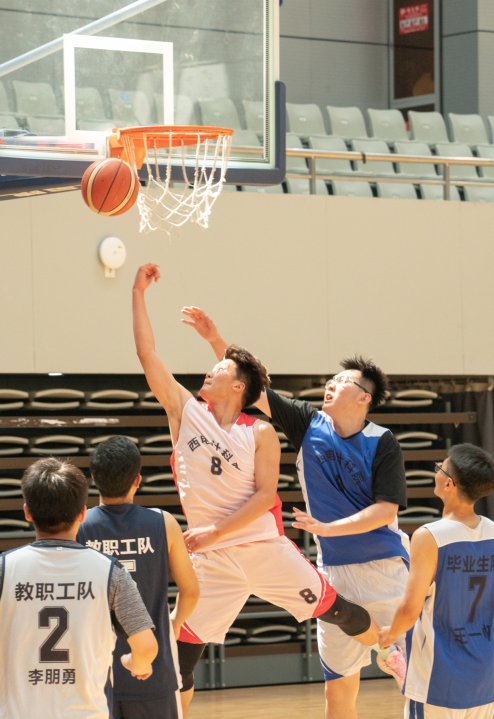 与平时在讲台上授课的老师们一起打球,毕业生同学们难掩兴奋和紧张。比赛分上下两个半场进行,上半场由教师队对阵员工队,毕业生队身手灵活、擅长强攻,教师队技术过硬、毫不示弱,双方以56:57结束了上半场比赛。下半场由教师与员工混合组队比拼,争抢更加激烈,两组最终以47:56结束了下半场比赛。