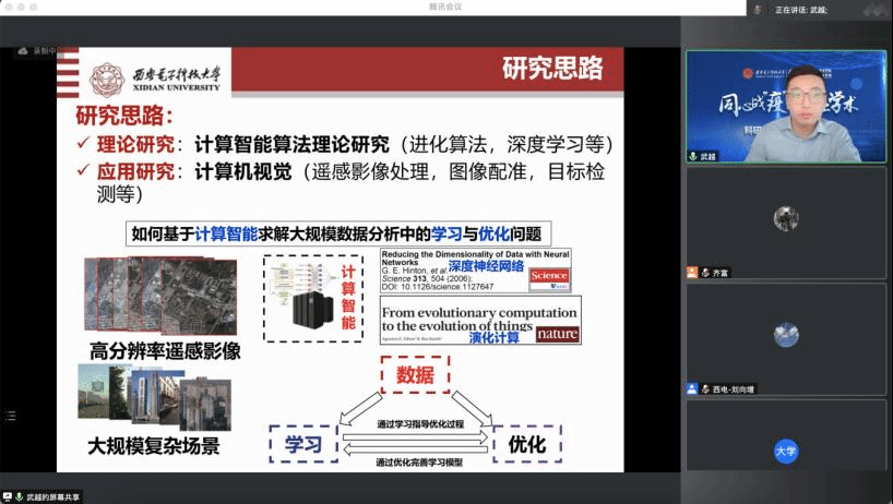 大数据与视觉智能研究所武越副教授作题为“基于计算智能的遥感影像配准与变化检测研究”的报告。武老师从遥感影像获取地物目标随时间变化情况复杂的现实需求出发,介绍了变化检测中图像的配准问题,分析了图像配准问题中多源、非线性、评价指标等配准难题。针对以上配准问题,他分享了从点特征配准到结合遥感影像特征的局部与全局匹配方法,并通过演化计算寻找变换参数、引入深度学习的深度特征获取图像块特征提升图像配准效果。最后他针对变化检测问题提出基于分类对抗网络消除干扰的变化检测和基于共同特征学习消除多源图像间差异的变化检测方法。