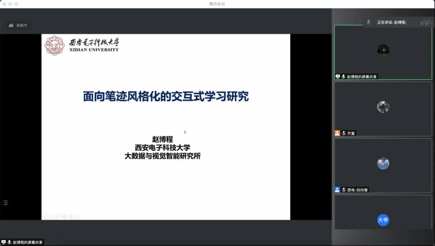 大数据与视觉智能研究所赵博程老师的报告题目为“面向文字风格的交互式学习方法”。他首先介绍了交互式学习方法的基础概念,深入分析了交互式学习的小样本和模型实时更新等特点,讲解了交互式学习与Online学习、Few-shot学习的差异。接着他以“教会算法写字”为例展开介绍文字关键点的图像配准、在线数据与离线数据的转换、小样本文字笔迹模仿等研究工作,并分享了在数据库有限的情况下解决难以生成风格多变文字符号等问题的思路。最后他对交互式学习未来研究内容与应用前景进行了展望。