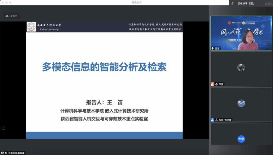嵌入式计算技术研究所王笛副教授分享的报告主题为“多模态信息的智能分析及检索”。为便于理解,王老师围绕指导研究生的研究工作,以提出问题、解决问题的方式分享科研思路和方法。她结合实例介绍了多模态数据和多模态机器学习的概念,着重介绍了多模态机器学习面临的语义与异构鸿沟等问题和相关解决思路。最后她就多模态度量学习、多模态哈希学习和多模态情感分析等研究分享科研体会,并总结多模态信息的智能分析与检索面临的最新挑战和相关应用。