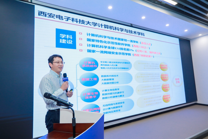 随后,沈玉龙教授与参会企业共同分享了《计算机技术前沿发展趋势》主题报告,并进行了开放应用场景的“揭榜挂帅”,从计算机科学与技术和软件工程两大学科,详细讲解了西电suncitygroup太阳成集团科学研究内容和技术应用场景。