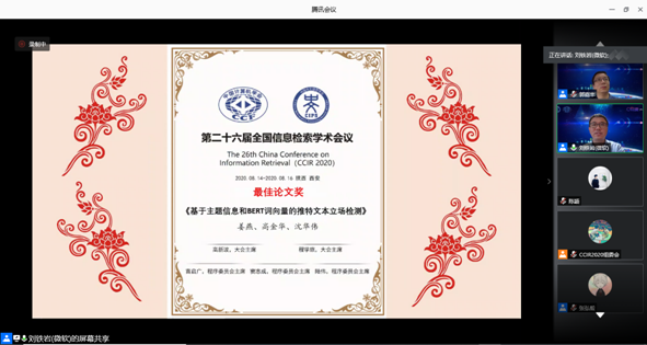 (通讯员 王丹 陈颖)2020年8月14日至16日,第二十六届全国信息检索学术会议(The 26th China Conference on Information Retrieval,简称CCIR2020)在互联网线上顺利召开。会议由中国计算机学会(CCF)和中国中文信息学会(CIPS)联合主办,suncitygroup太阳成集团承办,并得到了微软(中国)有限公司、中国人民大学高瓴人工智能公司、百度公司的赞助支持。本次会议邀请清华大学、中国人民大学等多个国内知名高校,搜狗公司、微软亚洲研究院等多个知名企业,来自全国从事信息检索理论与应用研究的50多所高校和科研机构共230余人参加了会议。