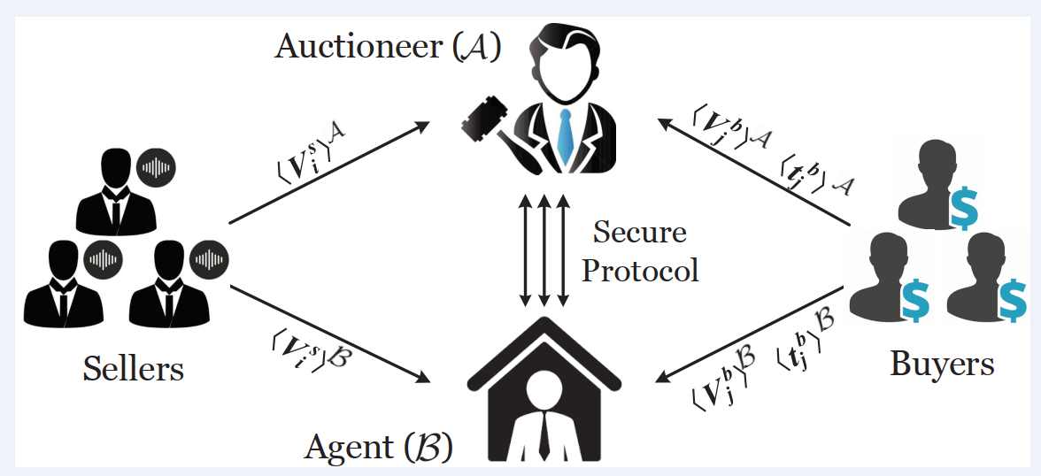 博士生程珂的论文“A Lightweight Auction Framework for Spectrum Allocation with Strong Security Guarantees”主要研究了隐私保护的频谱拍卖问题。拍卖被视作一种高效的频谱分配方法,现有的频谱拍卖方案主要侧重于经济特性的考量,而忽视了对拍卖过程中敏感信息的保护。然而,敏感信息的泄露也会影响到拍卖系统的正常运行。该文研究了隐私保护的双向频谱拍卖机制并提出了一种安全的轻量级频谱拍卖框架(Secure and Lightweight Spectrum Auction framework, SLISA)。首先,该文基于加法秘密分享、基础混淆电路等轻量级密码原语采用“Shuffle-then-Compute”的策略设计了一系列安全计算子协议。然后在此基础上设计了一种保护敏感拍卖信息及数据访问模式的双向频谱拍卖协议。最后通过形式化安全分析和实验验证了方案的安全性和高效性。