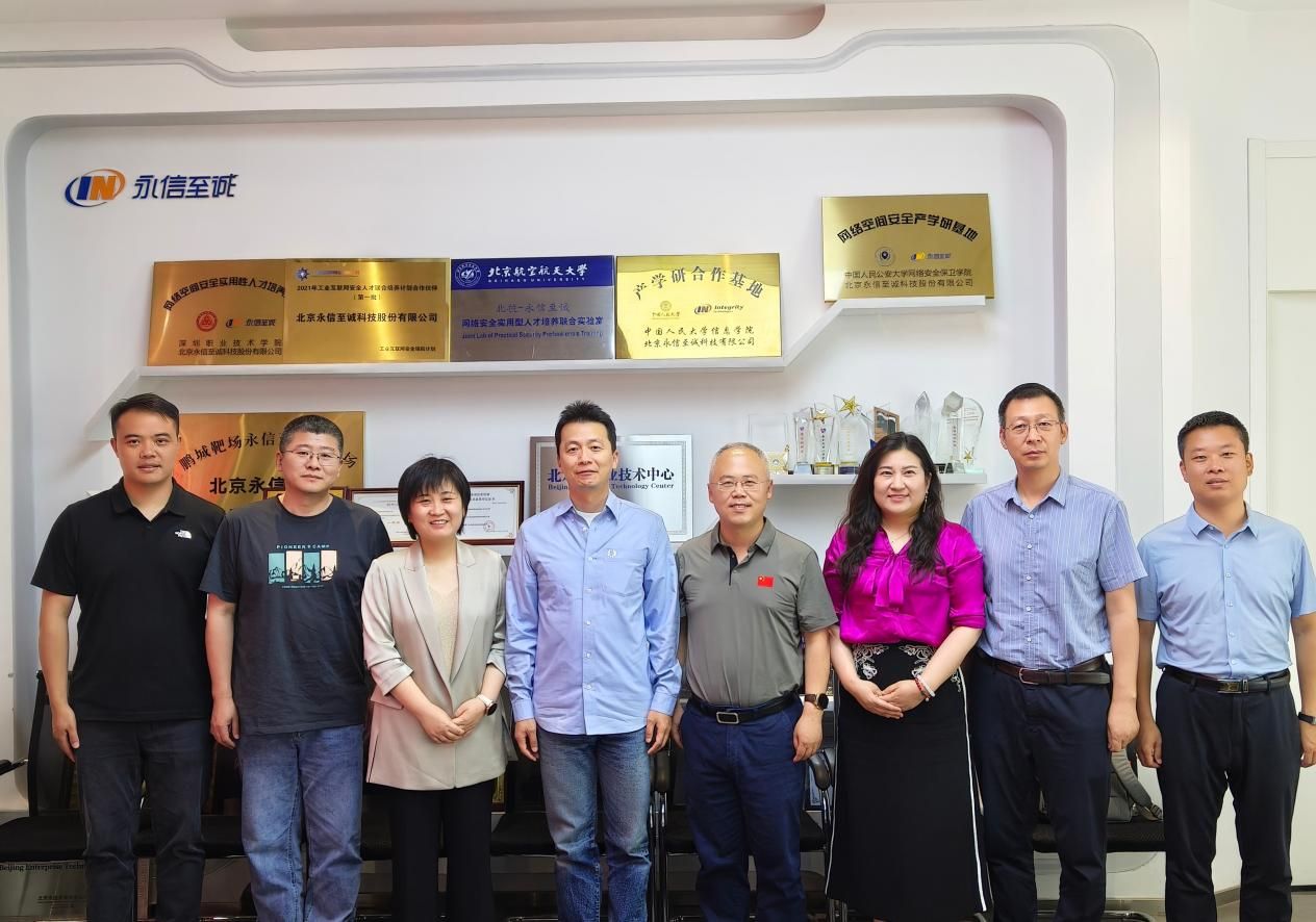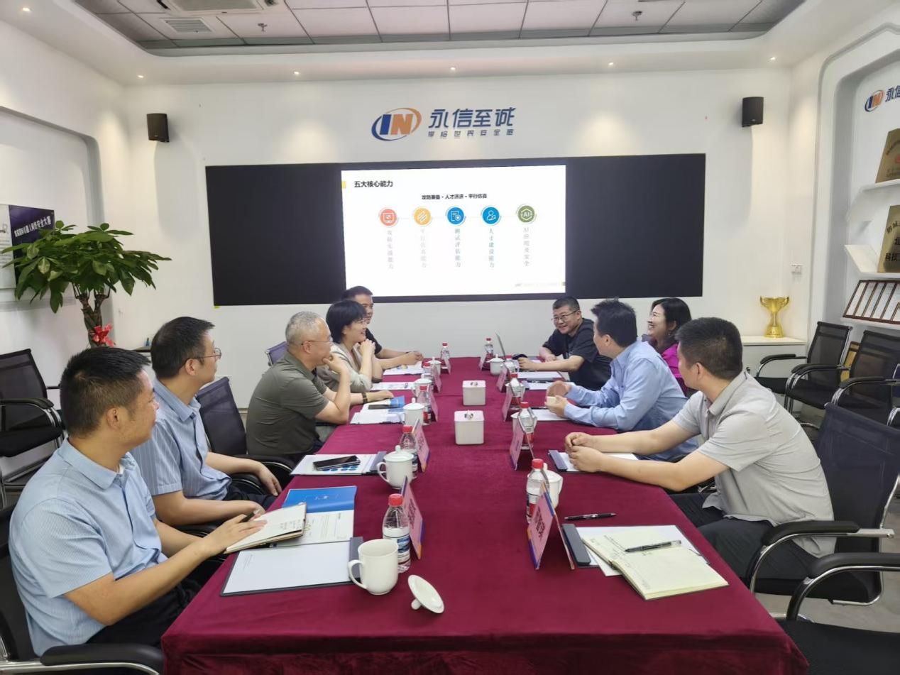 随后,调研组一行前往永信至诚科技集团股份有限公司总部,与公司董事长蔡晶晶、首席技术官张凯等座谈交流。永信至诚首席技术官张凯首先从关于我们、核心业务能力、重点产品与服务等方面对公司进行了介绍。永信至诚董事长蔡晶晶表示,公司聚焦网络与数据安全创新,首创数字风洞产品体系和高仿真网络靶场平台,建立了多场景人才培养体系,希望能与公司建立常态化合作机制,为数字中国建设提供专有人才支撑。李青山、张美茹分别介绍公司情况并一致认为,两个公司将不断发挥学科优势加强开拓融合,以工程应用为牵引,深化产学研合作,增强校企协同育人能力,支撑计算机与网络安全人才培养,增进员工对计算机与网络安全行业头部企业的了解,引导员工主动服务国家战略。